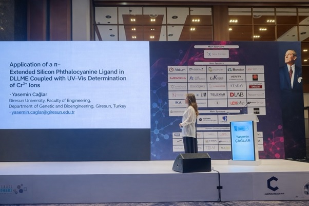 Bölümümüz öğretim üyelerinden Dr. Öğr. Üyesi Yasemin ÇAĞLAR, 05-08 Şubat 2026 tarihlerinde Antalya’da düzenlenen 14th International Drug Chemistry Congress kapsamında “Application of a π-Extended Silicon Phthalocyanine Ligand in DLLME Coupled with UV–Vis Determination of Cr³? Ions” başlıklı çalışmasını sunmuştur. Sunumda, krom (III) iyonlarının tayinine yönelik geliştirilen analitik yöntemin prensibi, uygulama aşamaları ve elde edilen bulgular paylaşılmıştır. Çalışma, çevresel örneklerde metal iyonlarının hassas ve güvenilir analizine katkı sağlamayı amaçlamaktadır.